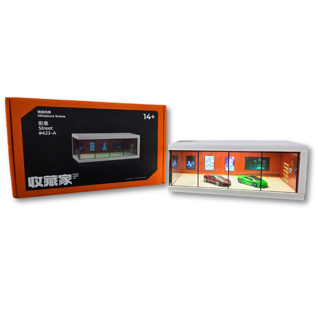 Transform your diecast collection into a high end display with this premium 1/64 Auto Showcase Diorama. Featuring warm wood style interior walls, full glass panels, and bright integrated lighting, this scene brings a luxury dealership atmosphere to any shelf or workspace.